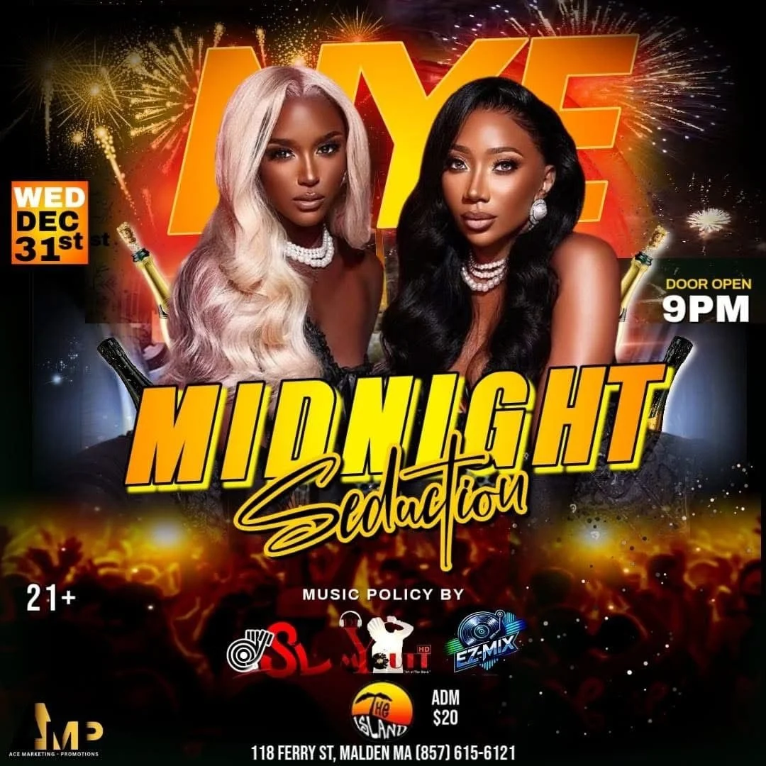 Midnight Seduction Wednesday, December 31, 2025 9:00 PM 11:59 PM 21:00 23:59 Island Caribbean Cuisine 118 Ferry St Malden, MA 02148 United States (map) Google Calendar ICS More details to come#DJSL #DJSL617 #SwatTeamMovement #TheCommission617 #Boston